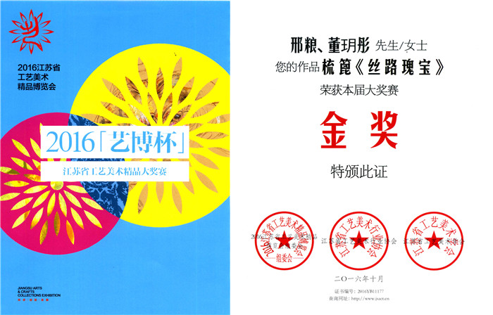 2016年10月《丝路瑰宝》荣获2016艺博杯江苏省工艺美术精品大奖赛金奖