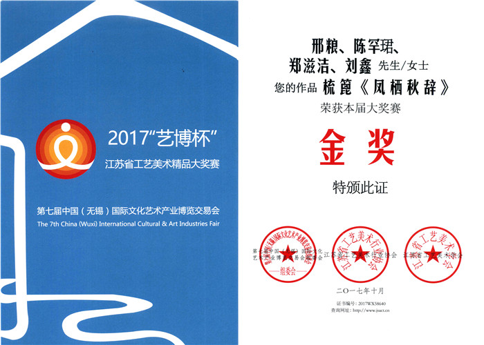 2017年10月《凤栖秋辞》荣获2017艺博杯江苏省工艺美术精品大奖赛金奖
