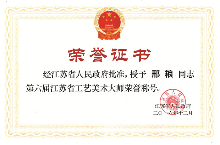 2016年12月授予江苏省工艺美术大师荣誉称号
