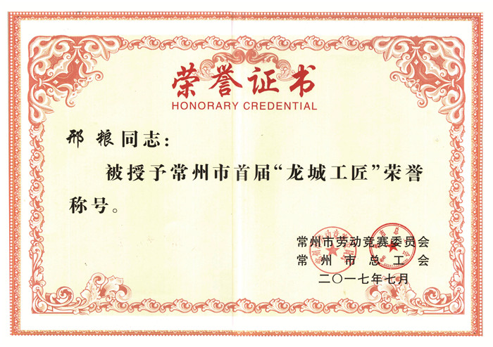 2017年7月授予常州市龙城工匠荣誉称号