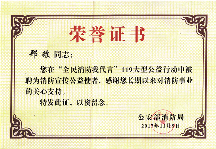2017年11《全民消防我代言》119大型公益行动中聘为消防宣传公益使者